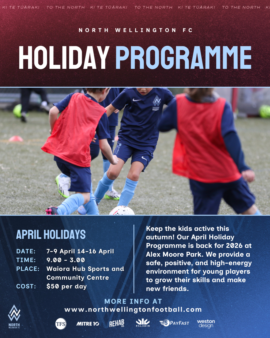 All sessions will be held at Alex Moore turf and the Waiora Hub 17 Bannister Avenue Johnsonville. We will endeavour to have most of the sessions on the turf however if the weather necessitates, we will use the Waiora hub as our indoor facility.